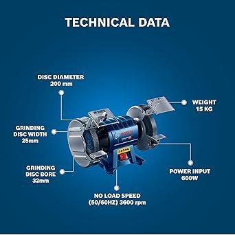 High-Power Performance – Equipped with a robust 600W induction motor, this double-wheeled bench grinder (15 kg) delivers 3,600 rpm for powerful grinding, sharpening, and finishing of tough materials.