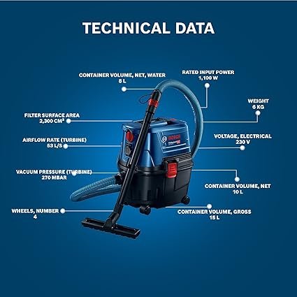 Powerful Performance: Equipped with a 1,100 W motor, delivering a maximum airflow rate of 53 L/s and vacuum pressure of 270 mbar for effective cleaning.