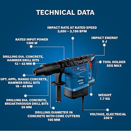 | Drilling dia. concrete, hammer drill bits | 12-42 mm |