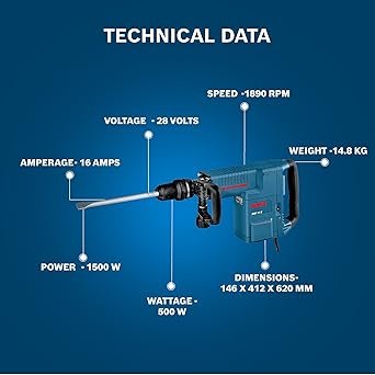 - High Demolition Power – 1,500W motor delivering 16.8 J impact energy for fast and effective concrete breaking.